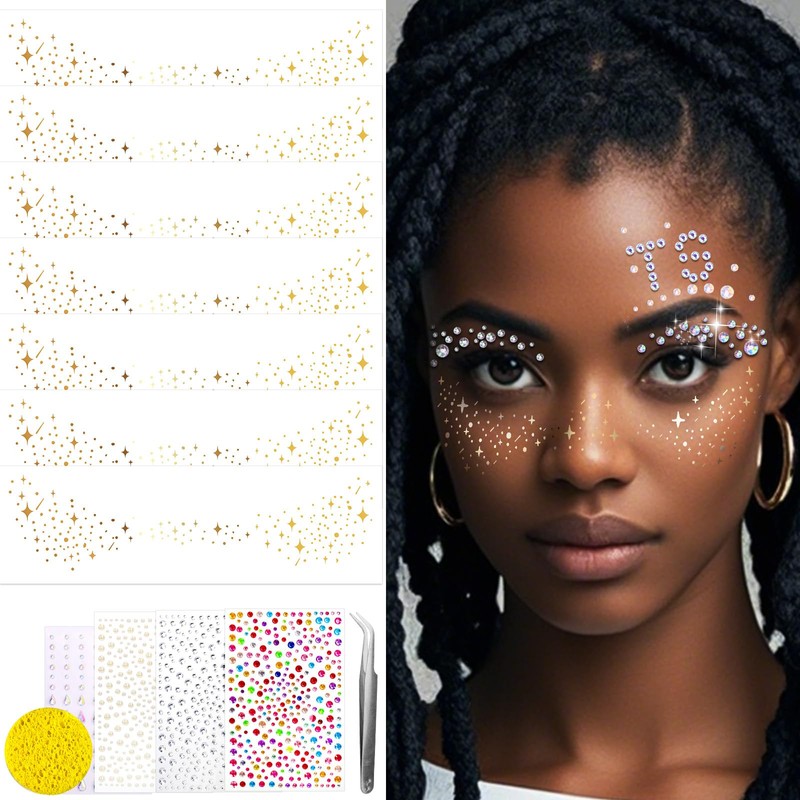- 【QUICK & EASY ON THE GO】: For busy mornings or impromptu appointments, face glitter and jewels make changing makeup easy and fast. In just a few seconds, you can add a bright golden shimmer to your face and liven up your makeup look, whether it's for a daily outing or a special occasion