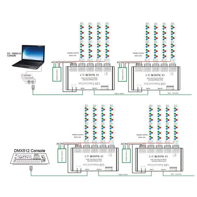- The DMX decoder can be controlled by the DMX Console, and can connected with numbers of DMX Decoder to expand the outputs to realize all kinds of changing shows.