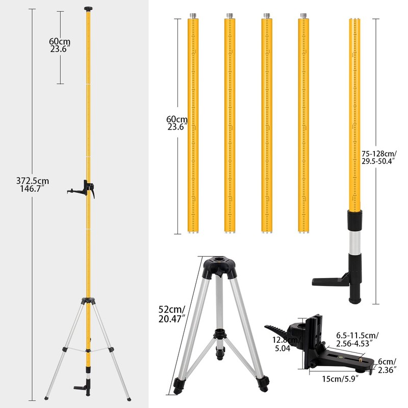 - Adjustable Telescoping Pole: This laser mounting pole allows for easy placement at any height between floor and ceiling, making it ideal for using laser tools on any jobsite. It includes 4 telescopic rods and a tail rod, extending up to 3.7 m/12 ft, with clear black graduations in inches and centimeters