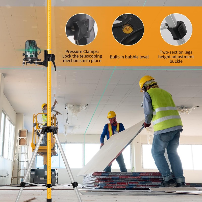 - Stable Tripod with Built-In Bubble Level: Constructed from standard aluminum with heavy-duty plastic joints and ribbed rubber feet, this tripod ensures long-lasting durability. It features two-section legs with height adjustment buckles and a screw clamp for stability. An embedded bubble level in the head ensures accurate measurements