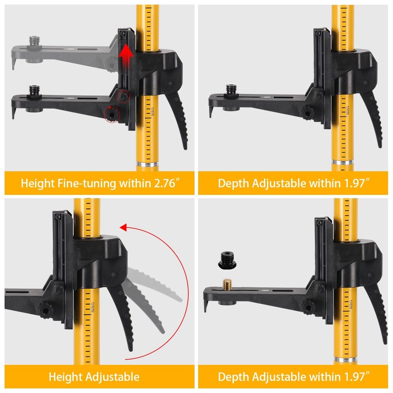- Multi-Function Mounting Bracket: The bracket features both 1/4" and 5/8" thread adapters, compatible with most line and rotary lasers. The adjustable bracket allows precise positioning of your laser tool at various heights, with a fine-tuning knob offering a 7 cm/2.75" adjustment range and a depth adjustment of 5 cm/1.97"