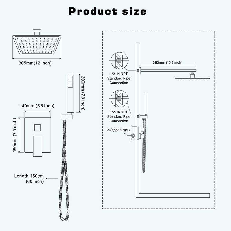 - 【You Will Get】12 inch Square rain shower head, handheld shower head 60 inch shower hose, shower holder, water control valve, install hardware include.