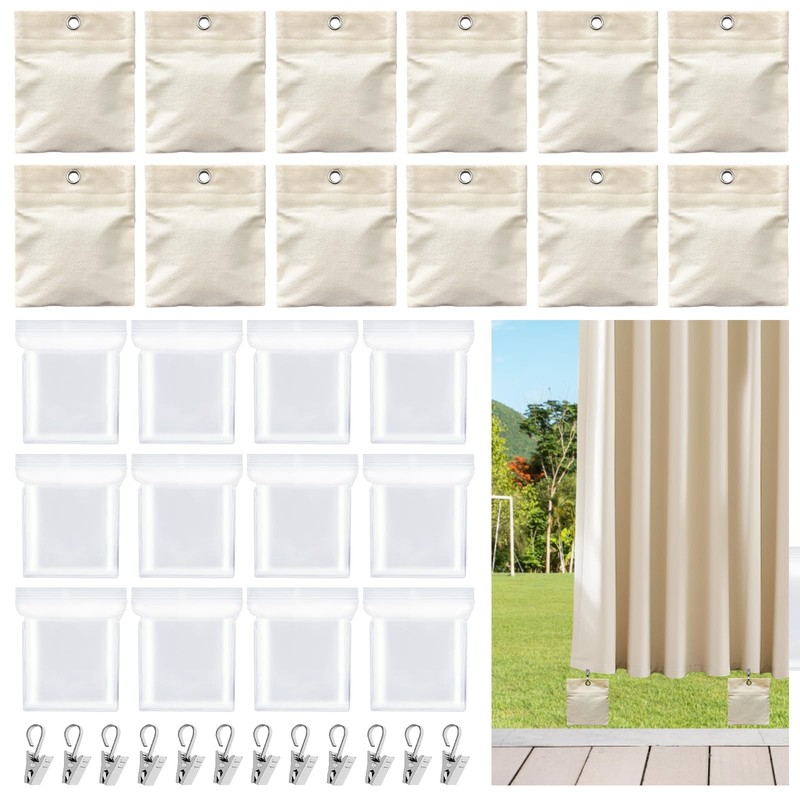 - What You Get: Set includes 12 x thickened canvas curtain weighted bags (each size 5"x6"), 12 x reusable PE inner bags, and 12 x rustproof metal clips .Each sandbag holds up to 16 oz (weight varies with filler density), letting you adjust based on different scenarios and wind conditions