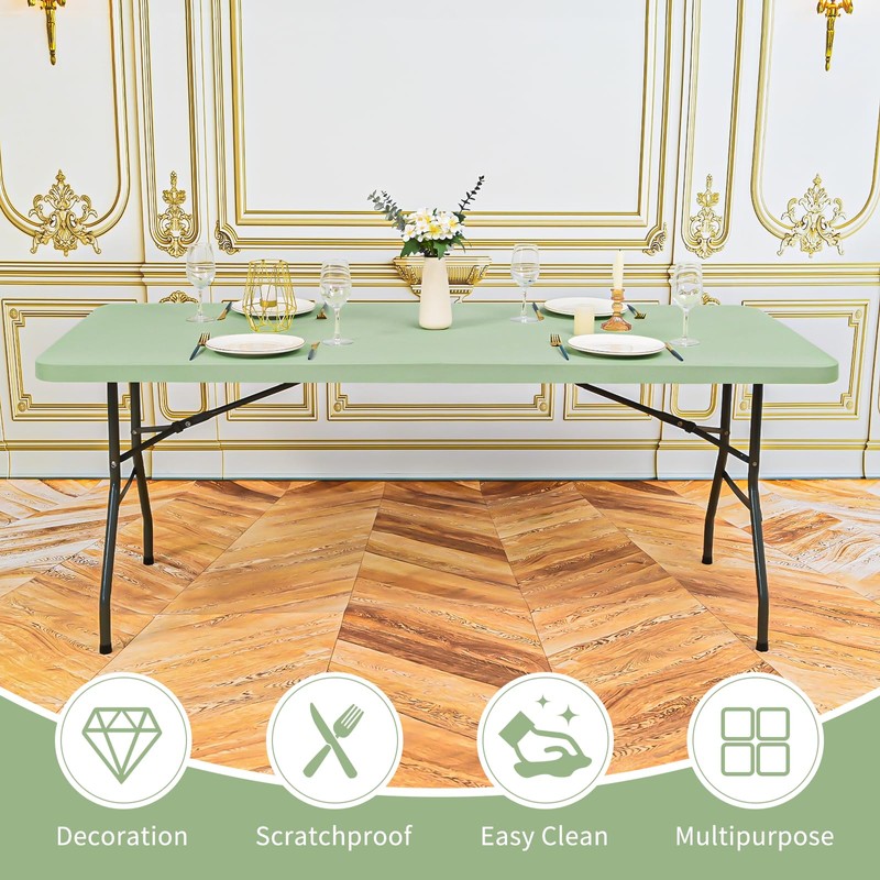 - 【Fitted Tablecloths For Rectangle Tables】This pack includes 12 Sage Green rectangle table covers, Fits any 6ft long banquet-style table, this cover is an ideal accessory for our 30in wide by 72in long folding tables. Our fitted tablecloths snugly wrap around your table, enhancing the appearance of your folding table. They ensure a clean and tidy look while providing a comfortable tabletop surface. Ideal for both indoor and outdoor events, these tablecloths are a practical and stylish choice.