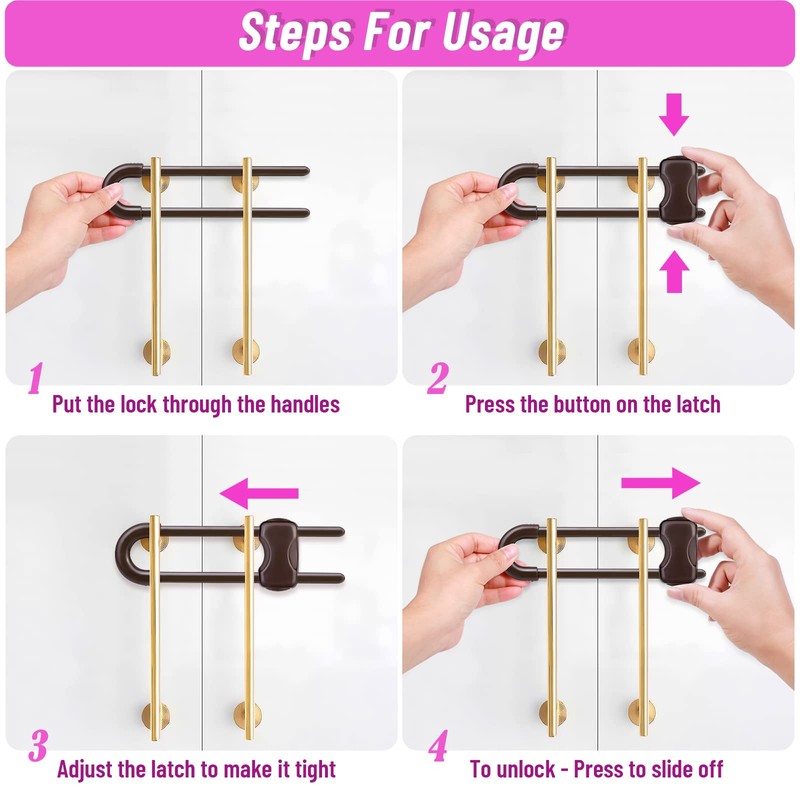 - 🔒【Smart Design】The U-shaped latches are reusable and adjustable. It is difficult for little baby to figure it out and unlock it due to the childproof design. Adults can open and close it easily. You can adjust the safety locks between 1 inch and 6 inches.