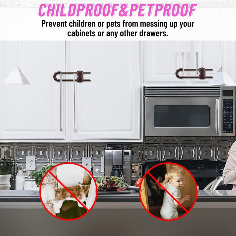 12 Packs Baby Proofing Sliding Cabinet Locks modacraft U-Shaped Child Safety Latches Adjustable White Locks for Handles Knobs Drawers Closet Cupboard - Brown