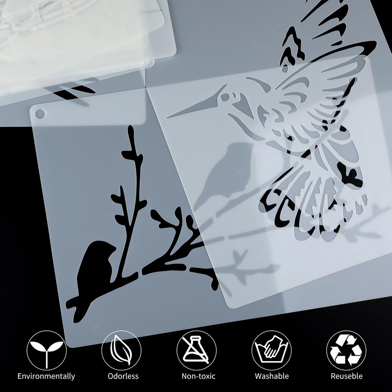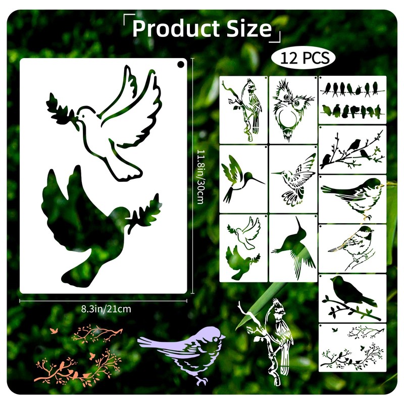 12 PCS Birds Stencils for Painting on Wood, 8x11 Inch Reusable Hummingbird Owl Painting Templates, DIY Craft Template Paint Stencils Set for Wall Rock Decor