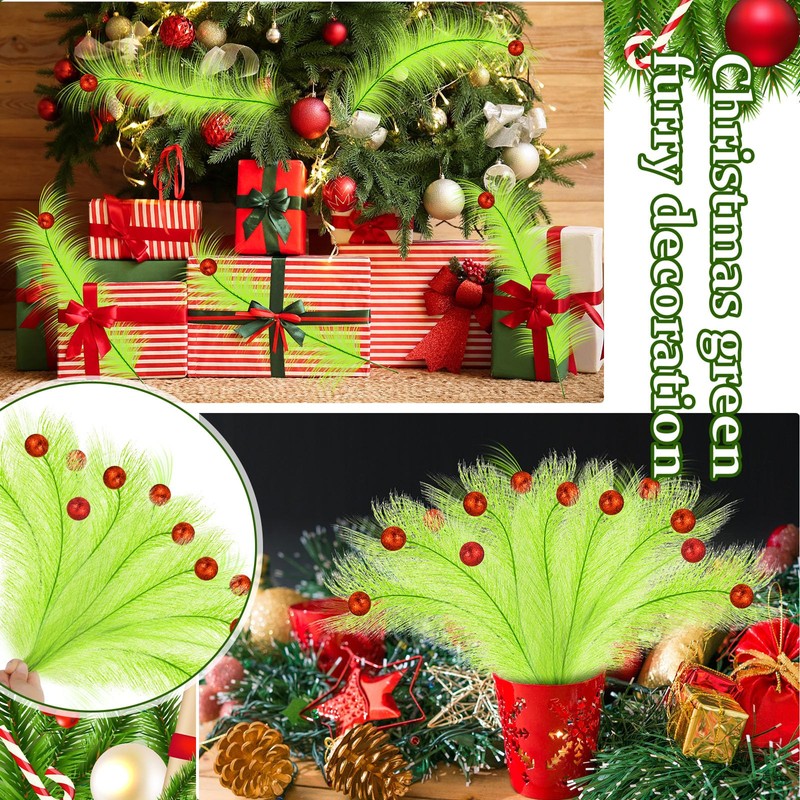 - Red Green Christmas Decor: this faux pampas grass decor is fluffy and dense, from a distance, it seems we can see familiar arms with long, furry green fingers holding a red Christmas ball ornament, these colors embody the classic Christmas color palette, bringing an instant festive feel to your space