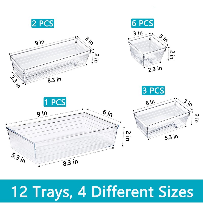 - VERSATILE SET: 12-piece drawer organizer set in 4 different sizes perfect for organizing makeup, office supplies, and household items