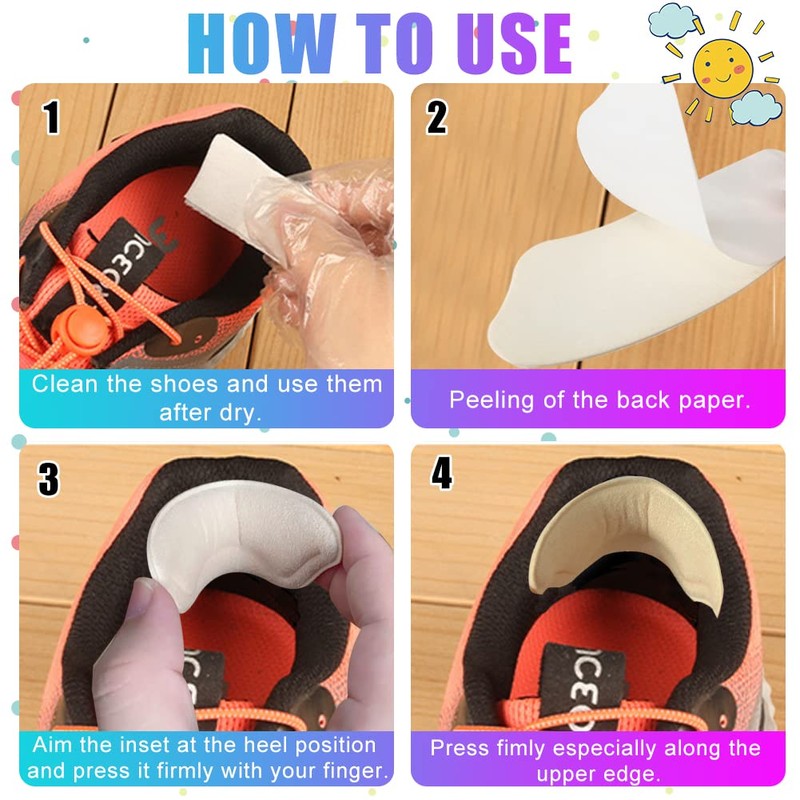 - 🎀Sticky Heel Grips for Kids Shoes: Our shoe heel inserts are easy to use, just remove the back cover, then stick the heel cushion pads on the shoes heels. The strong adhesive make the kids heel grips stay in places no matter walking, running, jumping or climbing.