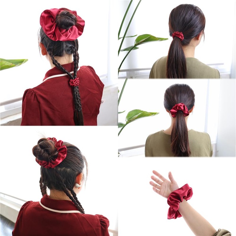 12 Pcs Mix 3 Sizes Satin Silk Scrunchies Hair Ties for Women Girls Bracelets Ponytail Holder Hair Bands Elastic Ropes Hair Bun Accessories (3 Sizes Bundle 12Pcs-Wine)