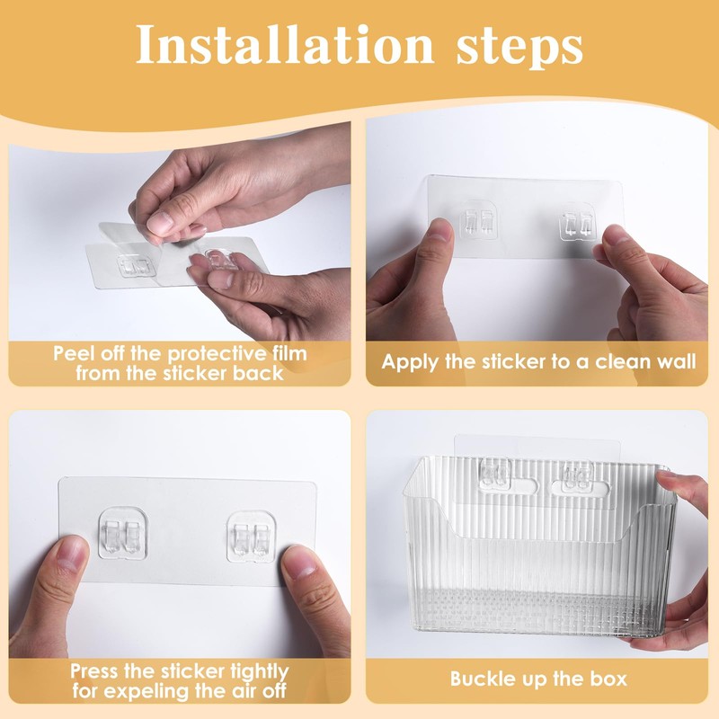 Each wall-mounted basket includes adhesive strips for easy installation, allowing you to create custom storage solutions without damaging walls. The small plastic bins are perfect for small spaces, making them ideal for bathroom counters or kitchen shelves.