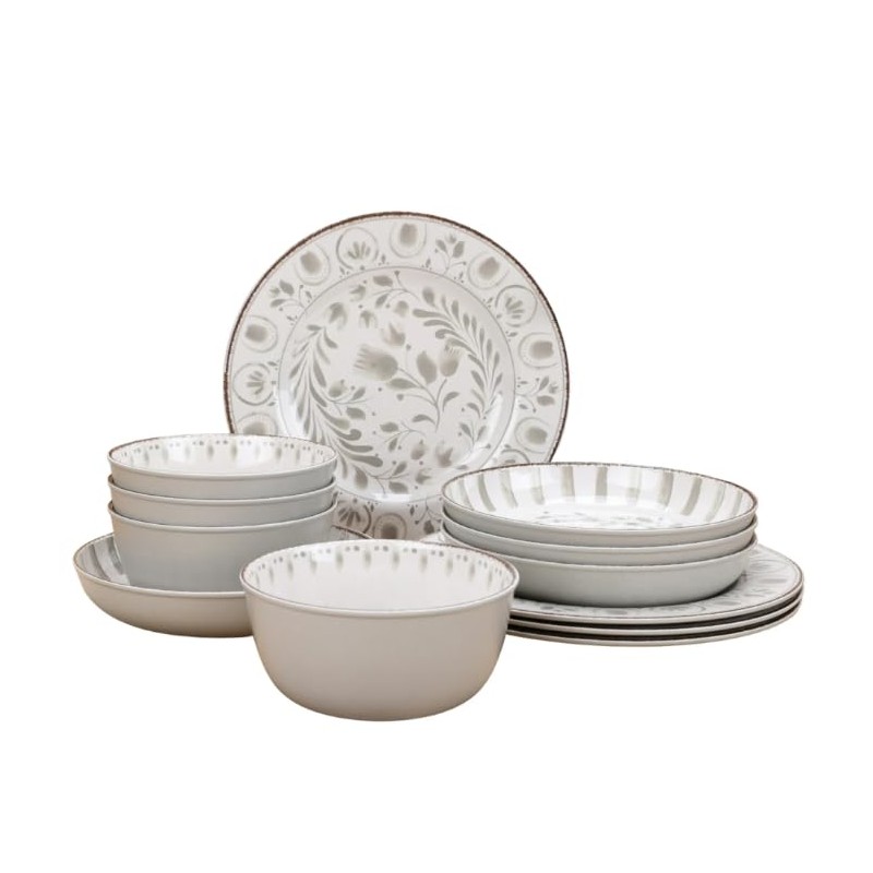 12-Piece Melamine Dinnerware Set for 4, Durable, Break-Resistant, Dishwasher Safe (Gray)