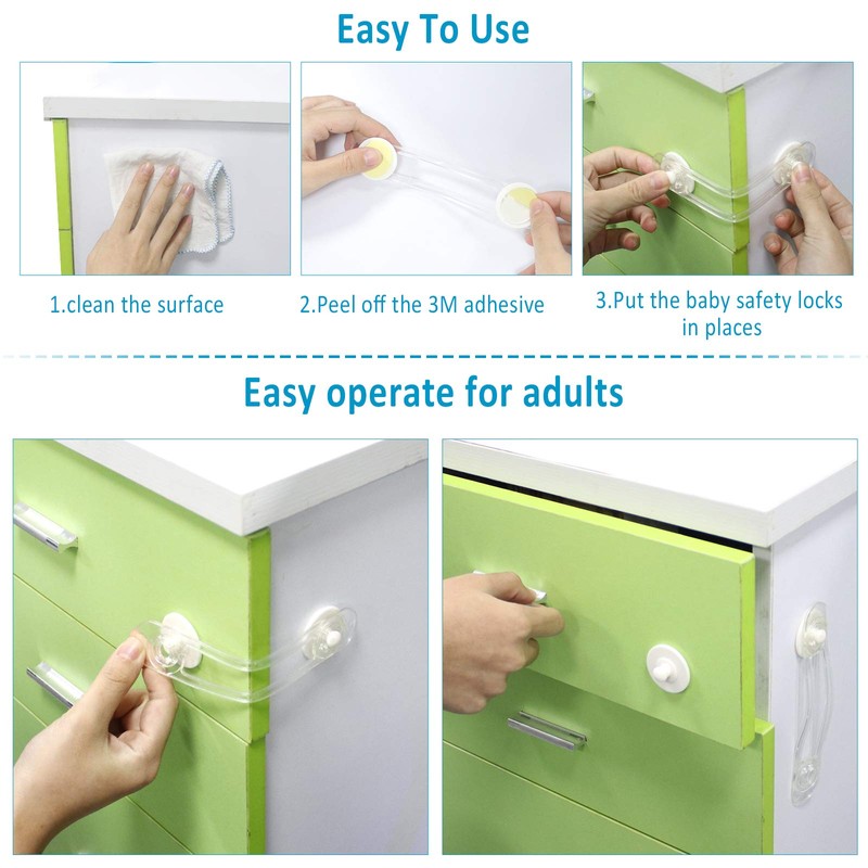 - Easy To Install: Just peel off the adhesive and put the baby safety locks in places. Strong adhesive can stick well on smooth surface and not easily fall, secure and firm.