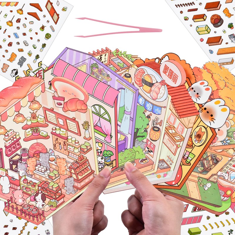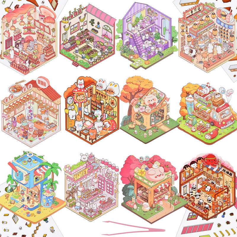 - DIY 3D House Stickers: You will receive 12 DIY 3D mini house scene stickers and a tweezer containing 12 different scenes including Cake shop, flower shop, igloo, BBQ shop, Bar, Pet shop, Snail Noodle shop, Dessert House, Cat Apartment, bakery, Sushi shop, very fun and creative.