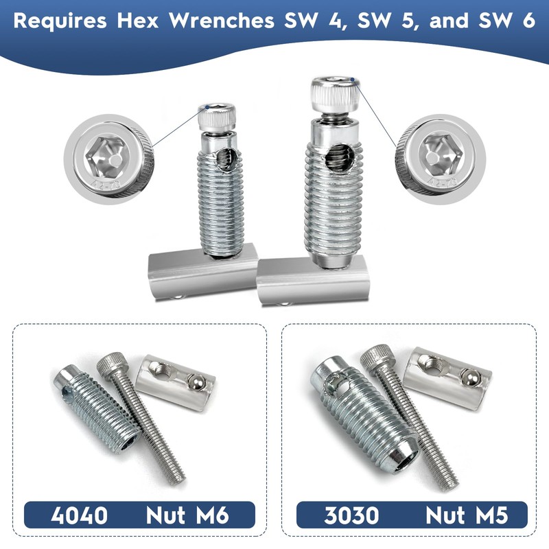 - 3.【Package includes】: the pack contains 6 pieces 30x30 series M5 pinball nuts, 6 pieces M5*35 hexagon socket screws, 6 pieces 30x30 series M5 threaded pipes, 6 pieces 40x40 series M6 pinball nuts, 6 pieces M6*40 hexagon socket screws, and 6 pieces 40 pieces x40 Series M6 Threaded Pipes