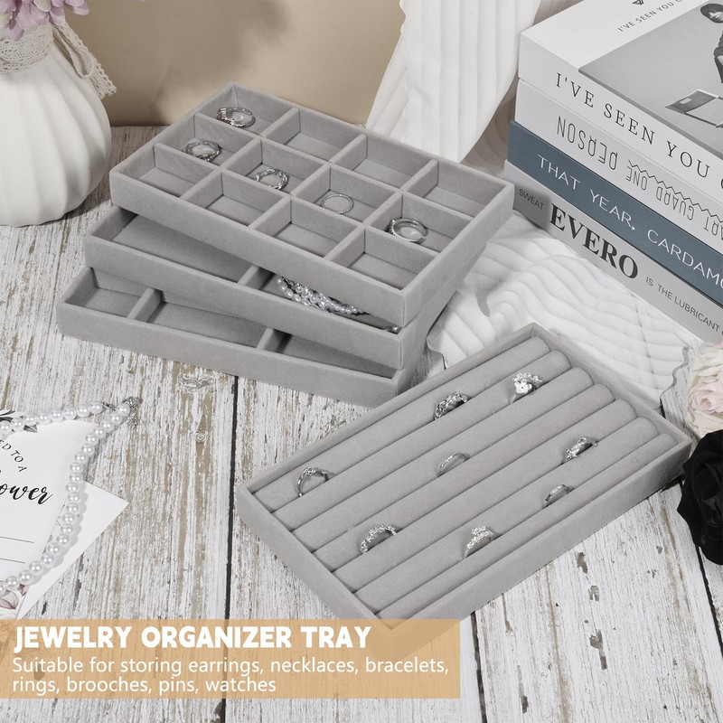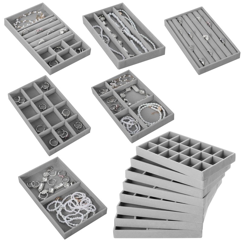 - Lieferumfang – Sie erhalten 12 Schmucktabletts aus Samt in 6 verschiedenen Ausführungen. Diese bieten Ihnen flexible Möglichkeiten zur Aufbewahrung und Präsentation Ihrer Schmuckstücke. Ideal zur Organisation von Ringen, Ohrringen, Halsketten, Armbändern und mehr – für Übersicht und schnellen Zugriff
