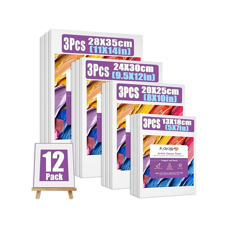12 Value Pack Stretched Canvases for Painting, Multi-Size (5x7, 8x10, 9.5x12, 11x14 in), 100% Cotton Blank Canvases, Acid-Free for Oil,Acrylic Paint, for Beginners & Pros, Kids & Artists