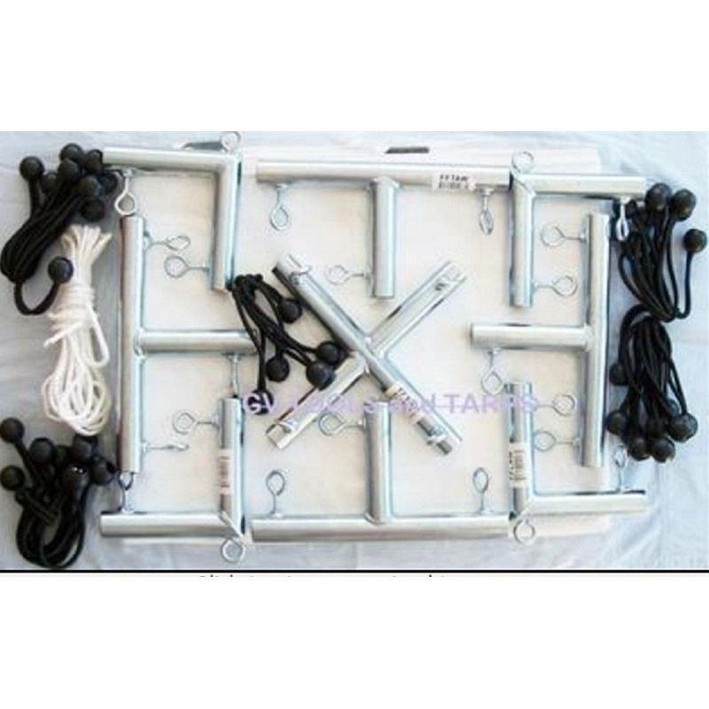 - Kit Includes: 12 x 16 White Heavy Duty Poly Tarp (Finished Size Approximately 11’6” x 15’6”), 3/4" Heavy Duty (Galvanized Steel) Fittings to connect your pipe to make the frame, Ball Bungees to attach the tarp to the pipe and rope to hang the kit