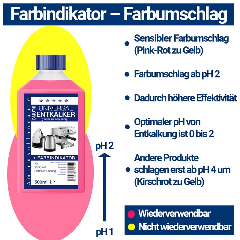 - ✔ [Sensitive colour indicator] A sensitive colour indicator is used, which changes colour from pink-red to yellow at above pH of 2. Most competitors first turn to yellow at pH 4. The highest effectiveness of a descaler at pH value 0 to 2.