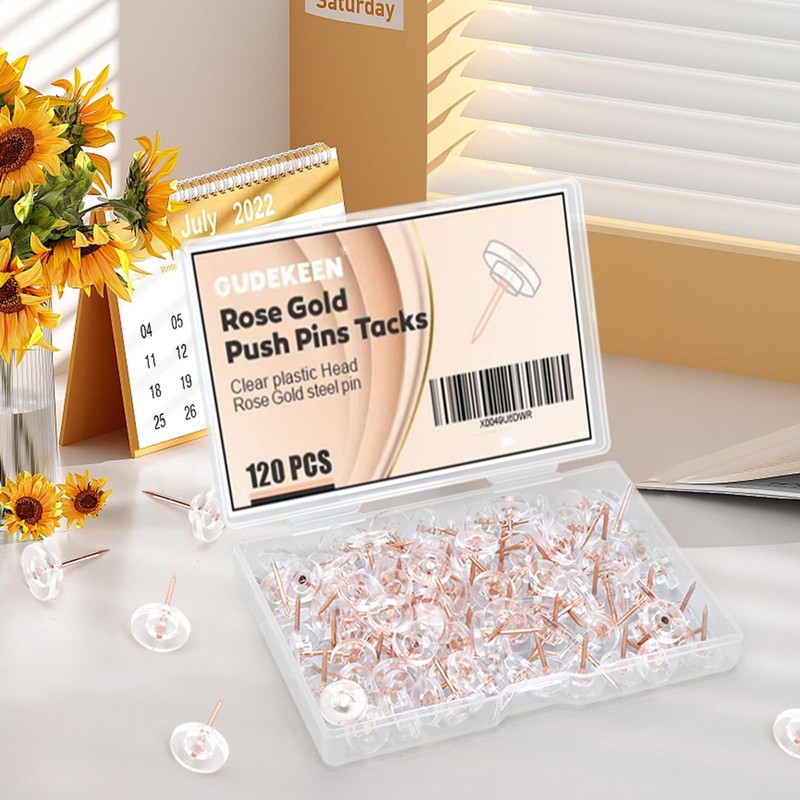 - Rosegold pushpin : 120 Pcs clear push pins packed in the reusable clear plastic box to keep your desktop or your desk drawer organized and improve work efficiency.