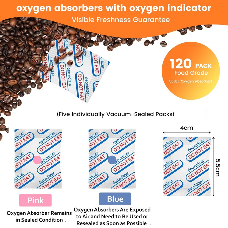 120 pack 500cc Food Grade Oxygen Absorbers(5 Pack in Individual Vacuum Bag, 24x Packs of 5), Oxygen Absorbers for Long Term Food Storege with Oxygen Indicator, Applicable to Mason jars, etc.