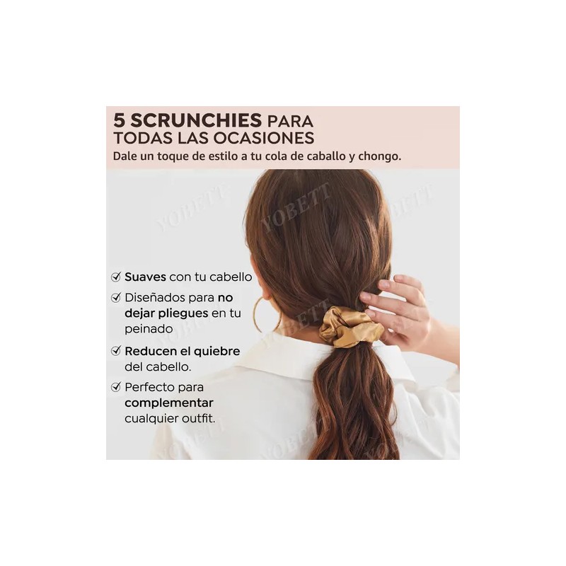- 5 scrunchies de satín 5 scrunchies de satín (Si te decides por el set negro, te llegarán 5 scrunchies en este clásico color; si prefieres el set de colores mixtos, ¡te sorprenderás con una combinación vibrante en negro, blanco, azul rey, rosa mexicano y dorado!)