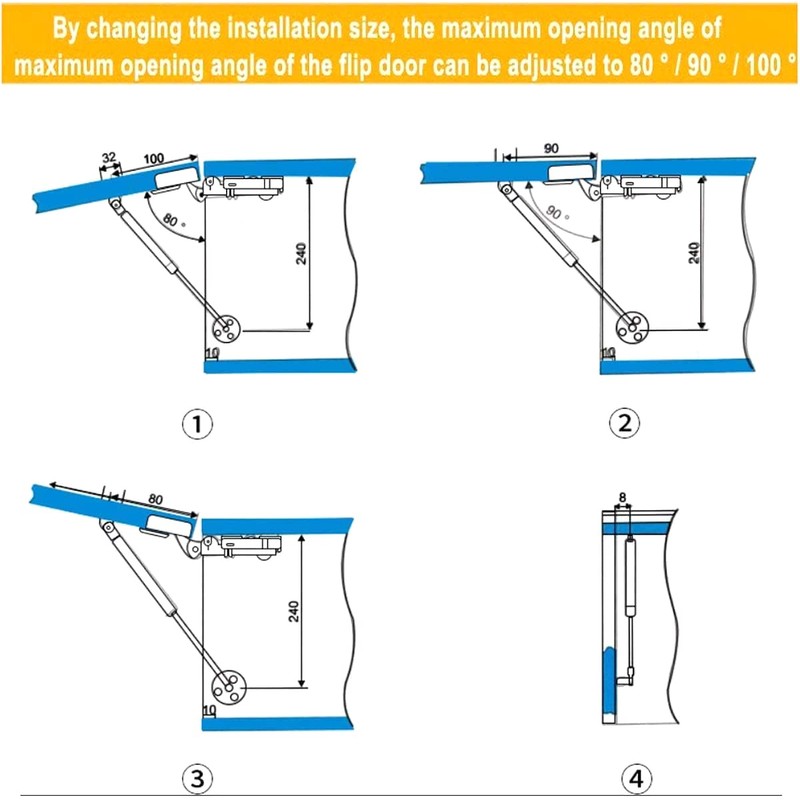 • 【Features】:Convenient opening and closing, cabinet door lifting, etc. Quiet, soft, convenient and safe. The maximum angle is 100 degrees. Great for propping up the lid to keep it open. Great for projects with small and light lids or doors.