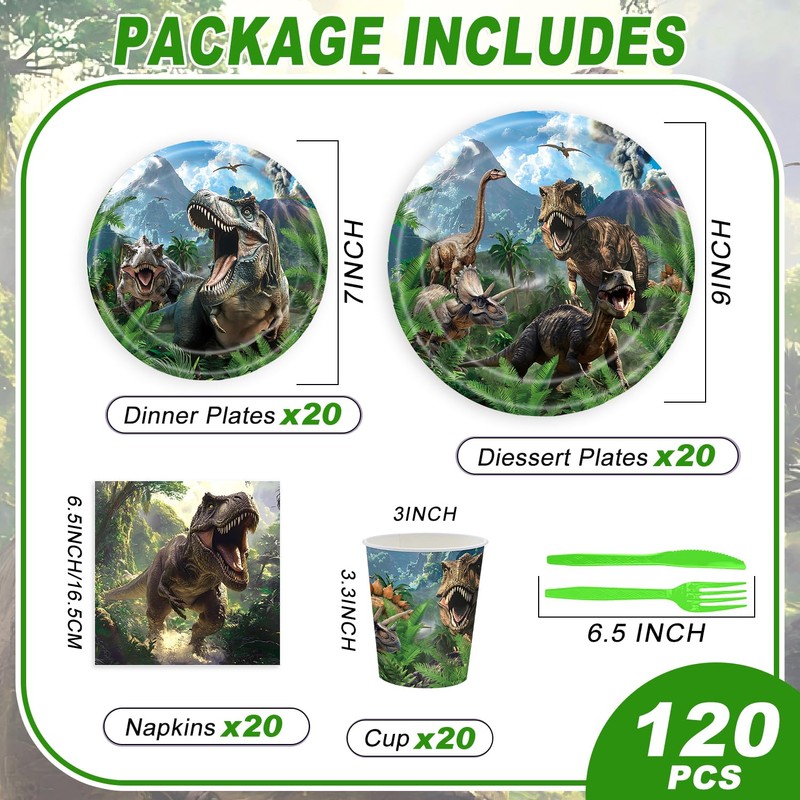 120PCS Dinosaur Party Birthday Supplies for Boys Kids Dino World Themed Tableware Set Dinosaur Park Party Decorations Tableware Set Plates Napkin Cups Set for 20 Guests