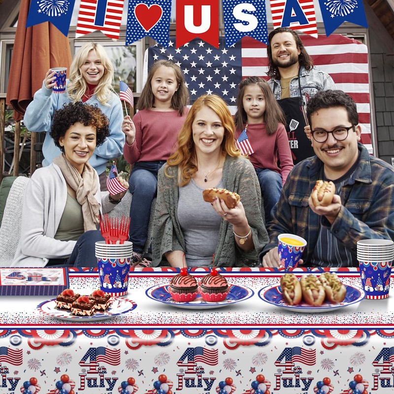 - Premium Material: All the 4th of july plates and napkins sets are made of food-grade and recycle paper, sturdy and durable enough to hold the cakes, desserts, fruits etc. and the 4th of July cups are made of durable thick 350gsm paper, thick enough to hold the hot and cold drinks, not easy to leak. The 4th of July tablecloth is made of thick PE material, durable and tear-resistant, waterproof and oil-proof, easy to wipe and clean, saving you much time in cleaning and have more time enjoying the 4th of July party celebration