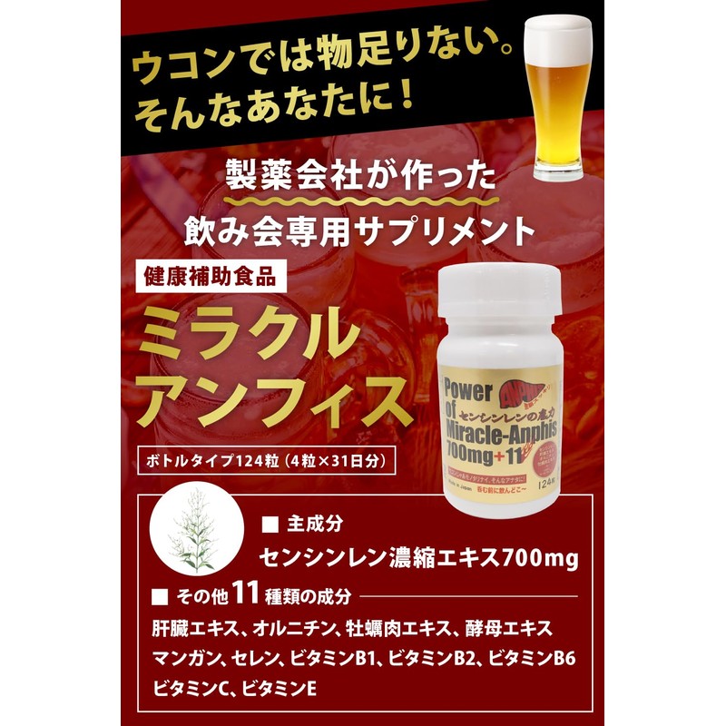 - 【ミラクルアンフィス+11とは?】ミラクルアンフィス+11は、センシンレンというハーブを主成分に、その他11種類の成分を配合したお酒が好きな方の健康を考えたサプリメントです。 このミラクルアンフィス+11で、ぜひ元気で健康にお酒を楽しんでください!!
