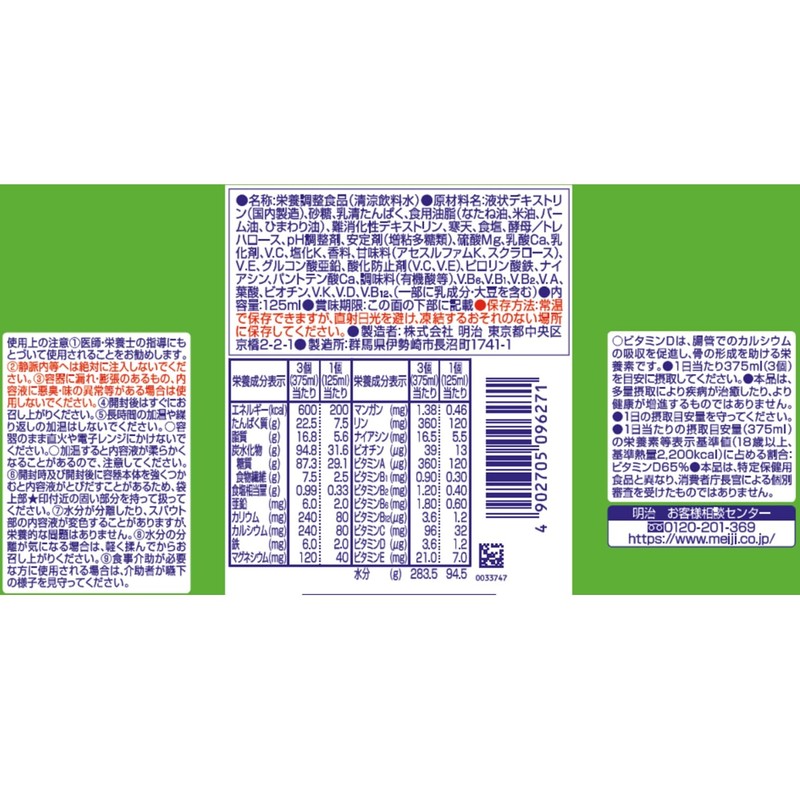 - 食事が十分に摂れない時や、食事のバランスが崩れた時に、食事の代わり、または食事にプラスして飲むことで必要な栄養が補給できる、ゼリータイプの栄養食品です。食事として摂取すべき栄養素をバランスよく配合し、1個133mlのスパウト付きパウチで手軽に栄養が摂取できます。
