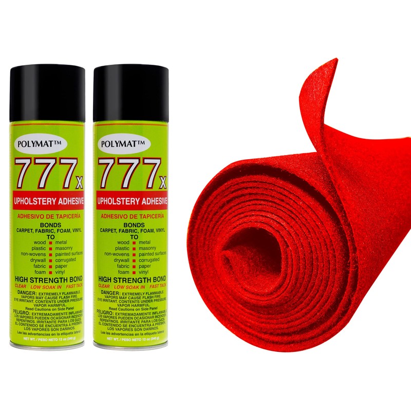 12FT x 3.75FT Red Carpet ROLL + 2 CANS of 777 Glue for Polymat Series 35 Latex Backed-Carpet FOR Non-woven Fabric will not unravel High resistance to gas, oil, and salt Extremely durable stands up to heavy use Extremely durable; stands up to heavy use Easy to cut and fit to desired shape or size. Solution dyed polypropylene for good colorfastness and UV protection Thickness: 3/32" (2.3 - 2.5mm) Series 35 Polymat Series 35 felt fabric is 40% more dense than Series 25 Polymat. Great for use with: Uses: Auto and home Speaker box covering. Auto, RV trunk and head liner. Craft fabrics for home and commercial decorative projects Wall covering- home, basements and commercial use. Fixture covering- game rooms, displays, shelving, counters... Music instrument cases, liners and displays. Light weight bunk trailer applications. Replacing your car's headliner Mobile DJ equipment Trade show booths, stage walls Mobile DJ and band speaker boxes and equipment. Heavier duty shelves, cabinets and case liners. Stage walls and floor coverings. Trade show displays and floor carpeting.Series 35 Boat and RV applications. 777 GLUE 20 OZ INDUSTRIAL GRADE SPRAY ADHESIVE CAN Fast drying, high tack glue. Heavy duty glue, great for gluing a wide range of materials (carpeting, foams, paper, cardboard, felt , cloth) to metals, wood and hardboard