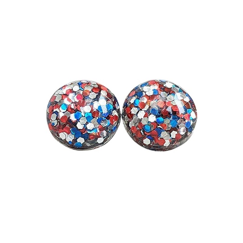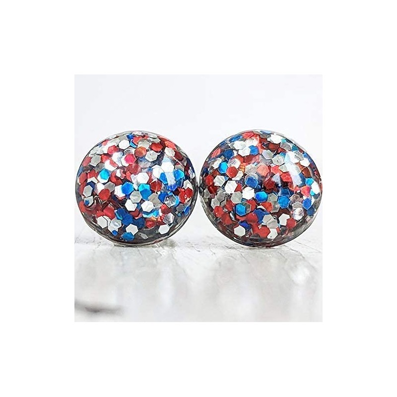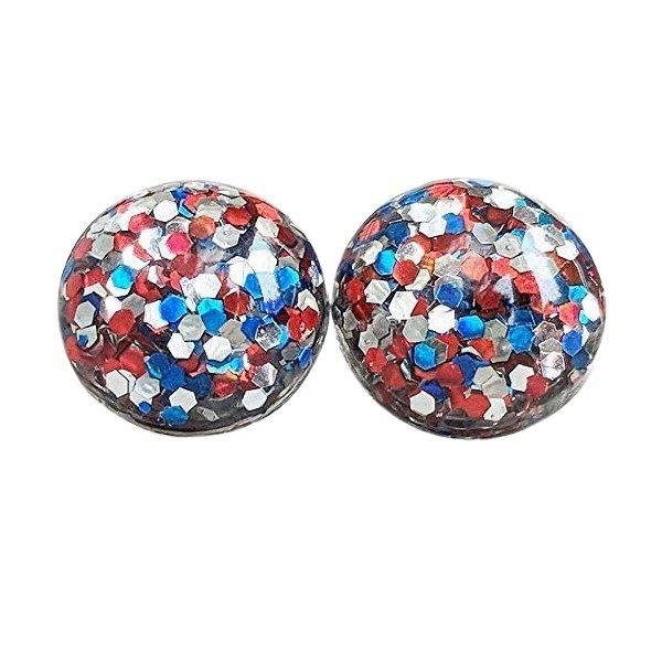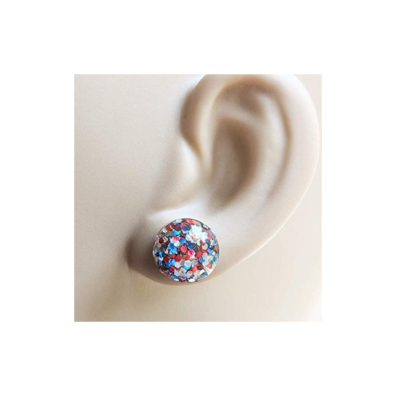 12mm Patriotic Red White Blue Glitter Bubble Stud Earrings - Hypoallergenic Surgical Steel