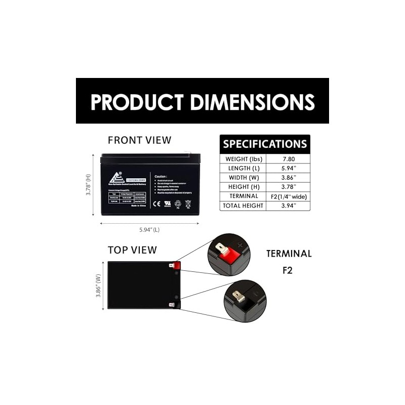 - BATTERY TYPE - 12 Volt 12 Amp 20 Hour Sealed Lead Acid Battery With F2 Style Terminals.