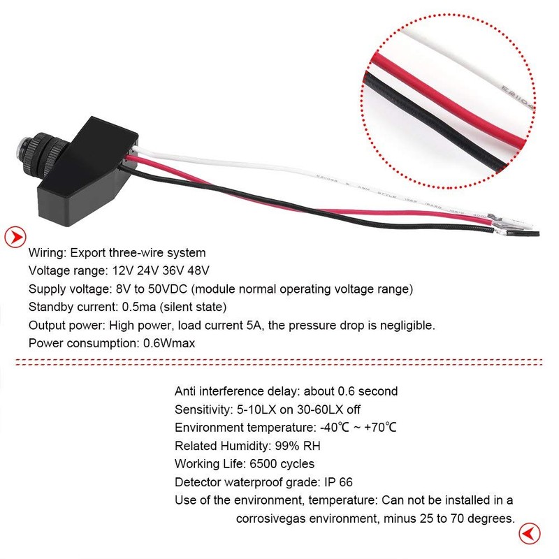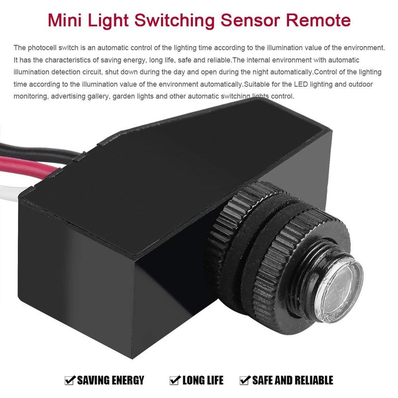 • ★★★★★The photocell switch is an automatic control of the lighting time according to the illumination value of the environment. Saving energy, long life, and reliable.(When using, please pay attention to the wiring method in the picture, otherwise it will not work)