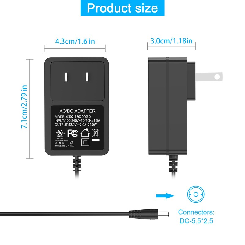 - [Power Supply Specifications: ] Inner Positive(+), Outer Negative(-), Input: AC 100-240V 50/60Hz, Output: DC 12V, Max 2A, 24W;Cable length: 5.9ft/1.8M, works for most of your 12V DC input devices
