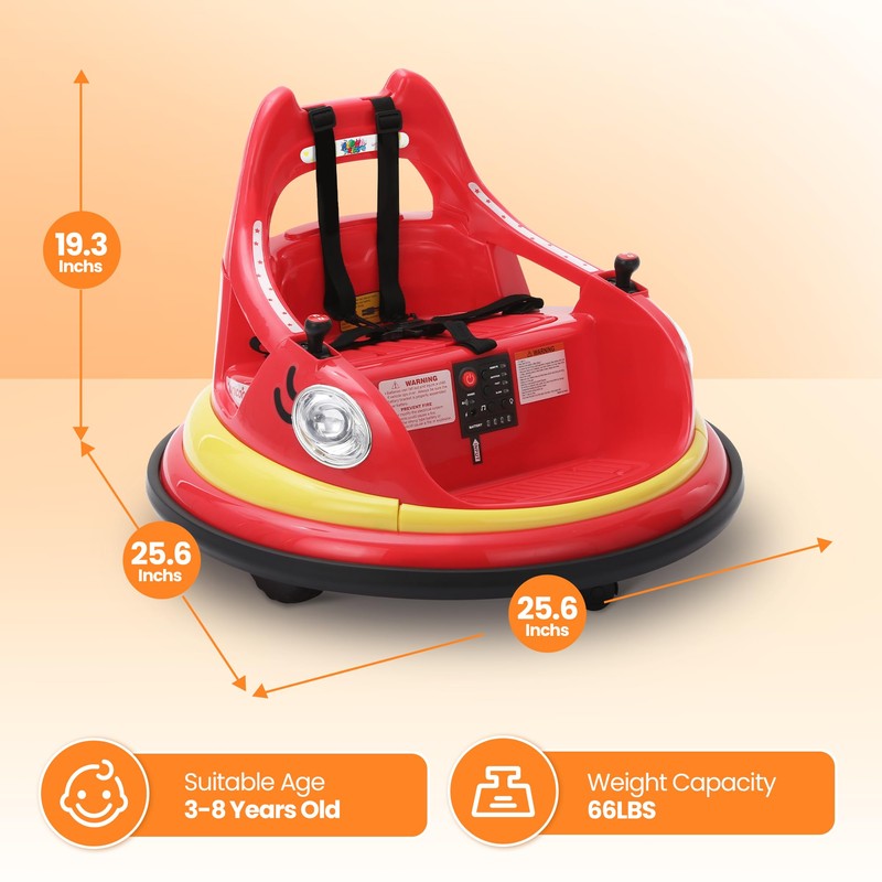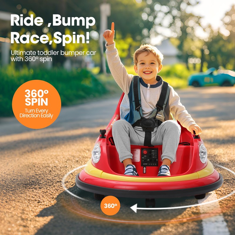 - Safer Gift: The electric bumper car is made of durable, non-toxic plastic. The body comes with a full circle bumper bar that reduces bumps from collisions and protects children from riding safely. This ASTM-approved ride-on car with an adjustable 5-point seat belt and run-flat tires provides added protection