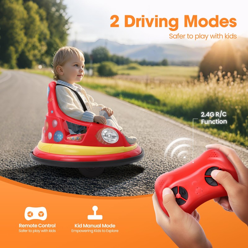 - 2 Driving Modes: This kid's bumper car has a double drive system, front and rear have universal wheels, kids can drive independently through the left and right joystick; parents can also be assisted by the remote control to drive, control the direction of the kid's toy car and speed to increase the safety of the age of younger children