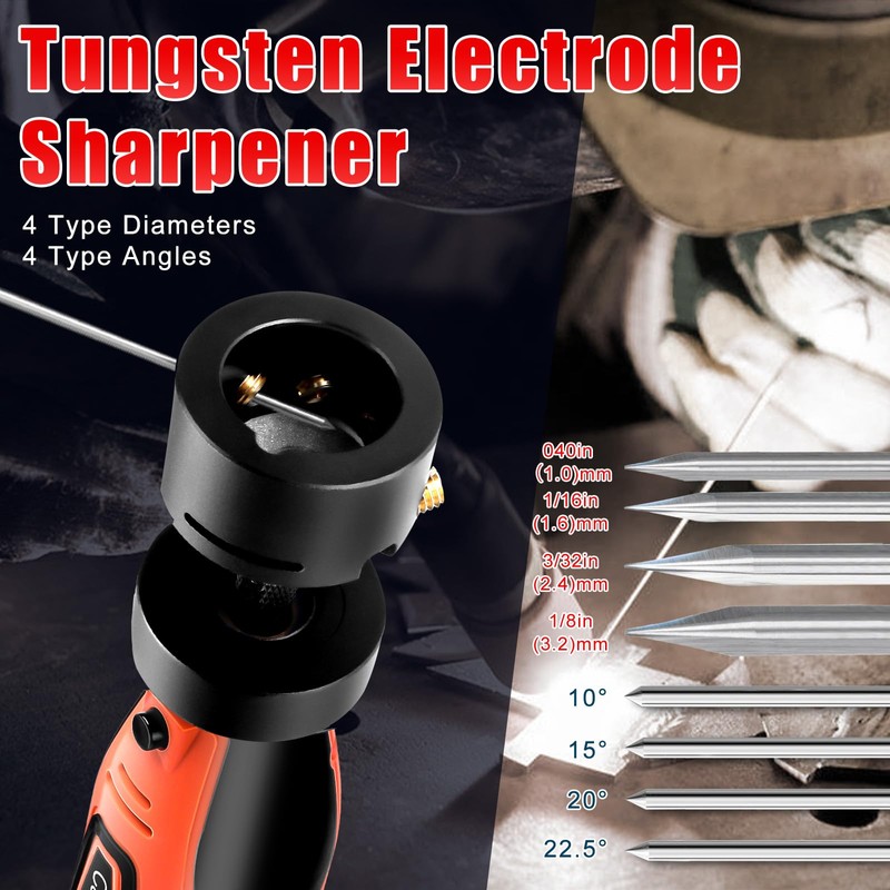• 4 sizes 4 angle tungsten electrode grinder head: 0.04 inches, 1/16 inches, 3/32 inches, and 1/8 inches (1 mm, 1.6 mm, 2.4 mm, 3.2 mm). It comes with four preset angles 22.5°, 20°, 15°, 10°(45°, 40°, 30°, 20° Tips Angle respectively), it ensures a consistently sharp electrode tailored to various material thicknesses, enhancing welding accuracy and output quality