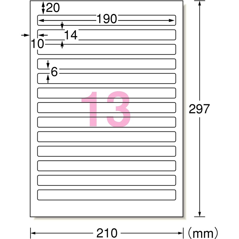 - A4-size 13 sides with margins on all sides Rounded corners / Sheet size: A4 size (810 mm x 297 mm) / Label size: 7.5 inches (190 mm) x 0.6 inches (14 mm) (1 row x 13 steps)