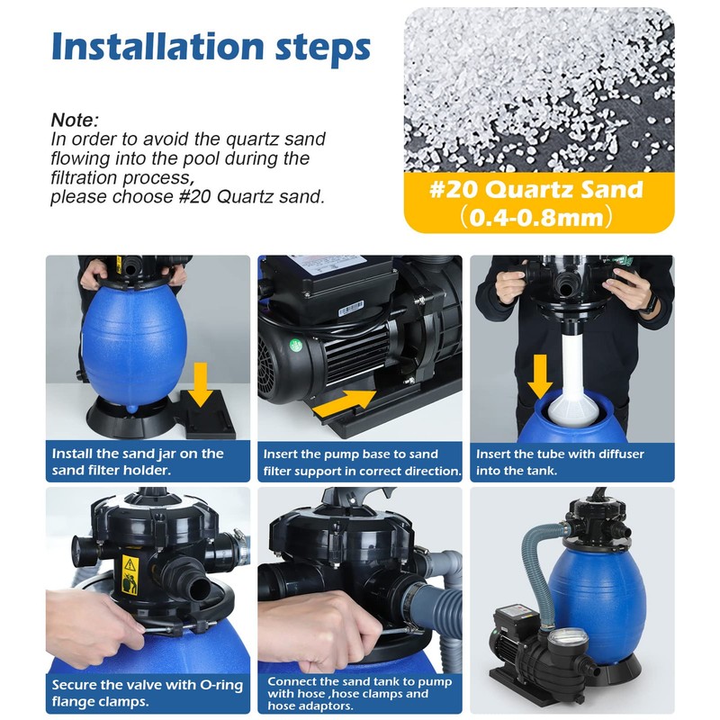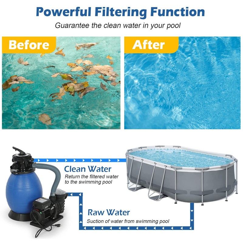 - Wide Application: his sand filter pump works well in the swimming pool, landscaped pool, SPA pool, support pool and can remove insoluble solids, suspended matter, colloids, particulate matter, fiber hair effectively in water, keep the pool water crystal clear and sparkling.It is a sand filter pump for above ground pool
