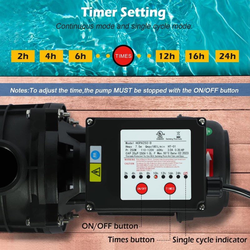 - Timer setting: Our Sand Filter Pump equip with 24 hours timer enables you to set automatic filtration times for the pool to save on daily maintenance.there are two operation modes in control panel: continuous mode and single cycle mode