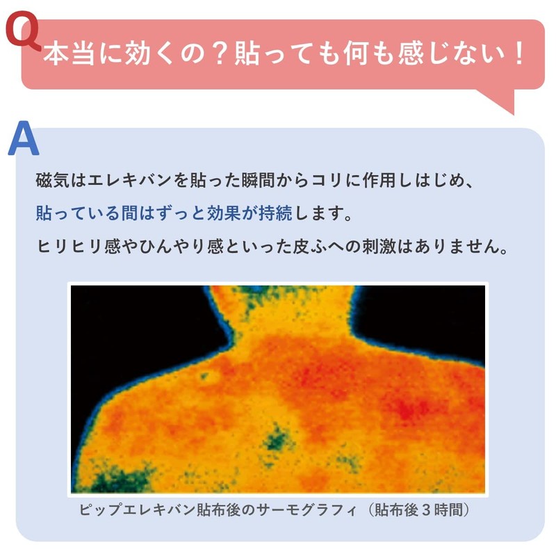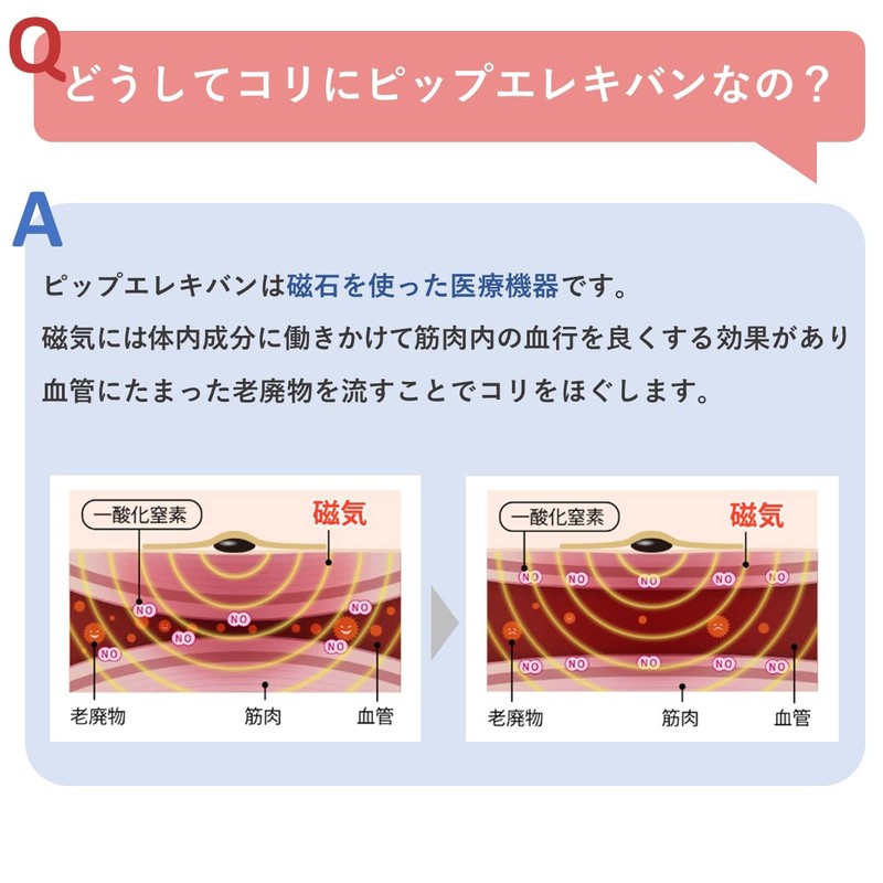 - 【血行改善】ピップエレキバンの磁気は、体内成分に働きかけて筋肉内の血行を良くし「老廃物」を流すことでコリの悪循環にアプローチし、コリをほぐします。