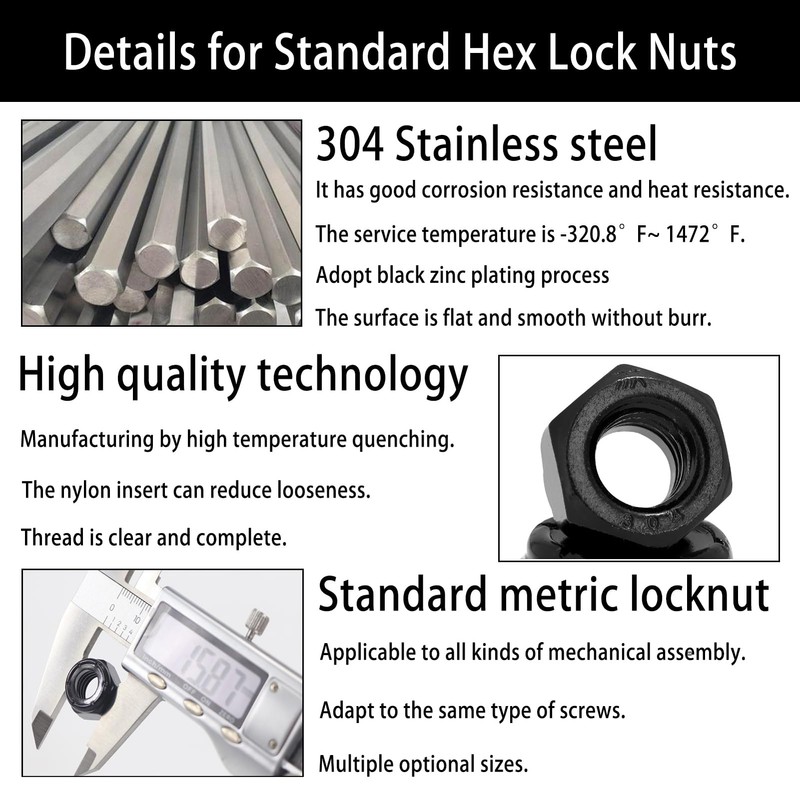 - This is 304 stainless steel black oxide lock nut, which can provide good rust prevention, corrosion resistance and adapt to other harsh environmental conditions.