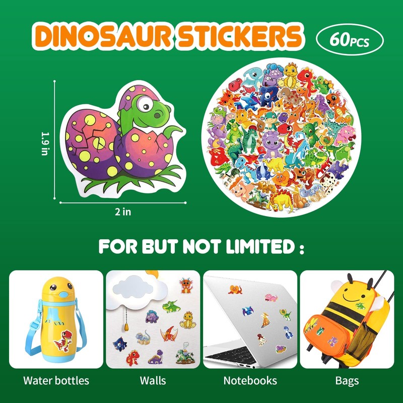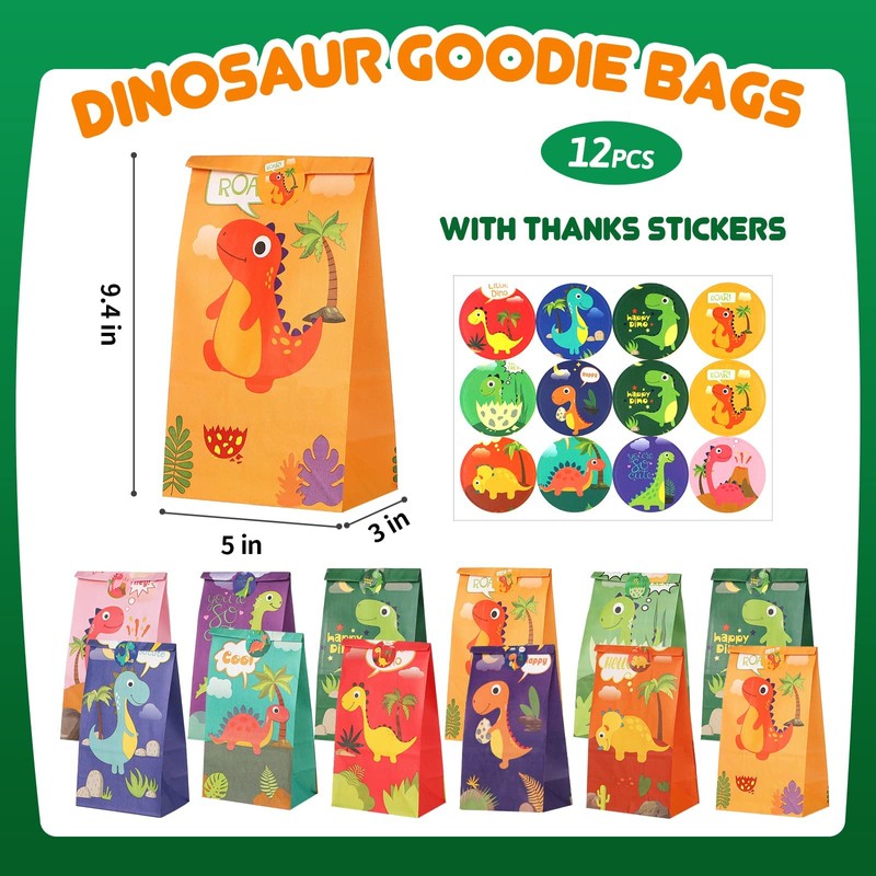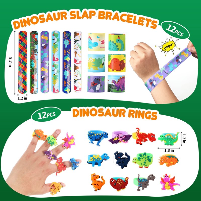 - ✅136 PCS DINOSAUR PARTY FAVORS FOR 12 KIDS - 12 Dinosaur Goodie Bags, 12 Dinosaur Eggs That Hatch In Water , 12 Dino Kids Rings, 12 Dinosaur Slap Bracelets For Kids, 12 Mini Dinosaur Figures Glow In Dark, 12 Dinosaur Tattoos Temporary For Kids, 60 Dinosaur Stickers. Unique Dino Party Favors For Kids Birthday.