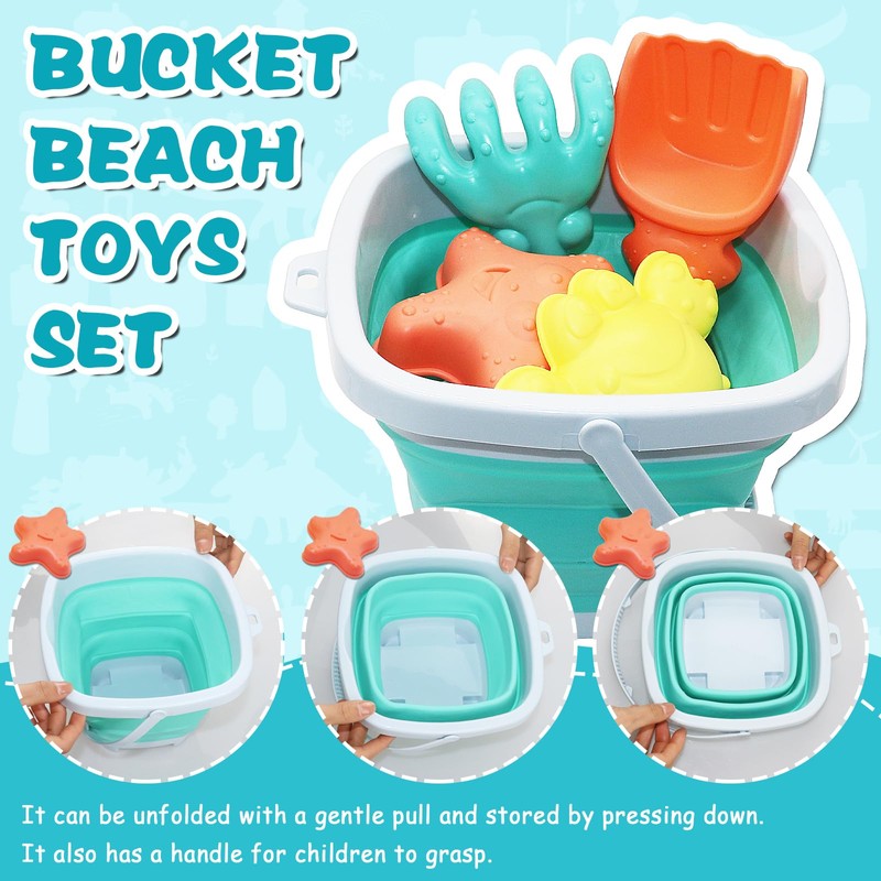 - 【Bucket Beach Toy Set】You will receive 13 play sand tools for kids: 1 folding bucket, 1 rake, 1 shovel, 3 sea animal molds, 6 sand castle molds, 1 mesh bag. The perfect beach toy set can make children play happily.