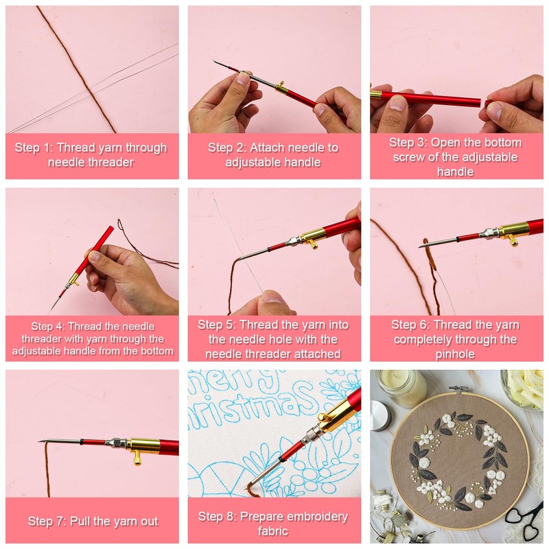 - Easy to Use: Open the bottom of the adjustable handle, pierce the yarn through the bottom of the punching needle, and then use the needle threader to pass the yarn through the needle hole. It is easy to use, and even beginners can get started quickly. (When adjusting the length of the needle, pay attention to align the screw and slowly tightening it to ensure stability.)
