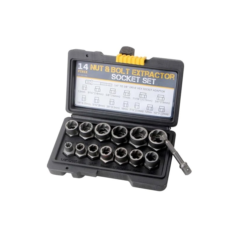 - Produktinhalt: Sie erhalten14-Teiliges Muttern Entferner Set. Diese Abmessungen dieses Schraubenausdreher Satz umfassen: 1/4 " (6.35mm), 5/16" (8mm), 3/8 " (9.5mm), 10mm, 7/16" (11mm), 12mm, 1/2 " (12.7mm), 13mm, 9/16" (14mm), 5/8 "(16mm), 17mm, 11/16" (17.5mm), 3/4 "(19mm) Schlagschrauben und Mutter Demontage und 3/8" Treibergröße.