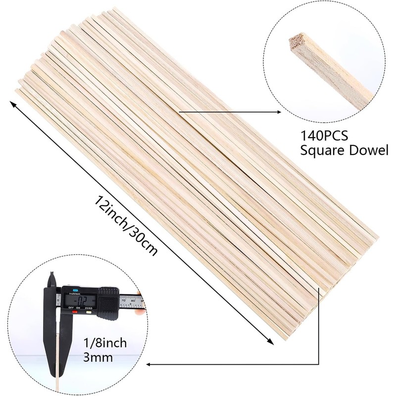 - 【Packages Included】You will get 140pcs 1/8" x 1/8" x 12" square wooden dowel rods for crafting, large quantity to meet your daily different needs.